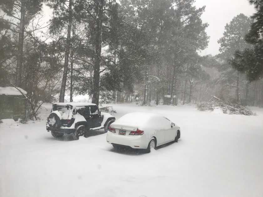 Of course, this isn’t even close to what’s happening in New York or Canada. But for us here in the south, it’s a little bit of a big deal. Things tend to shut down around here when snow is on the ground. South Carolina is not equipped for snowy weather.