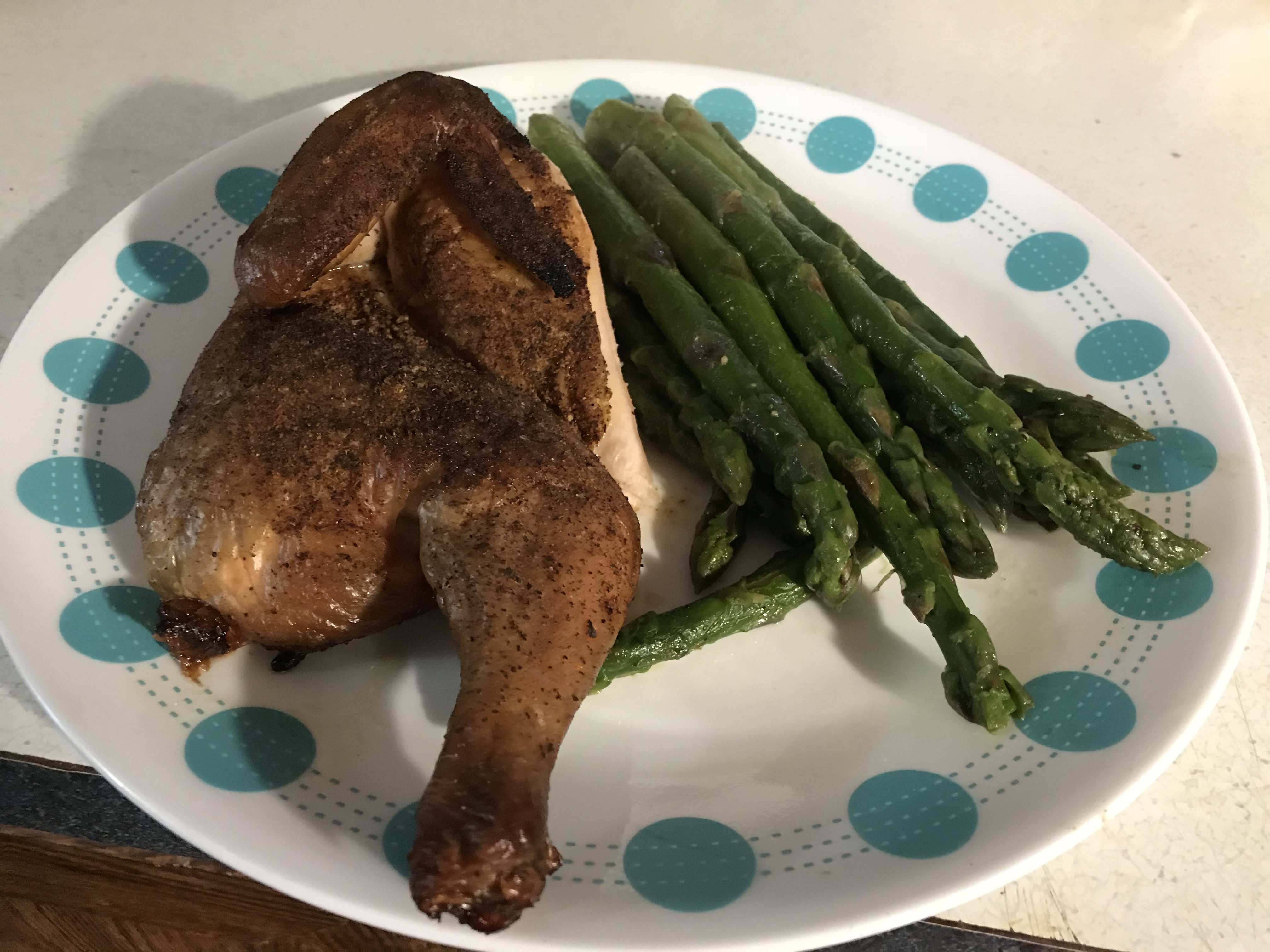 Took me about 20 minutes to get the grill going. In the meantime, I seasoned my little bird with salt, black pepper, garlic powder, chili powder, and cumin. All of these ingredients would be in my rub if I’d made one. I cooked the bird for about an hour and a half. Once it got close I steamed my Asparagus, then, added some salt, pepper, and a little butter.
