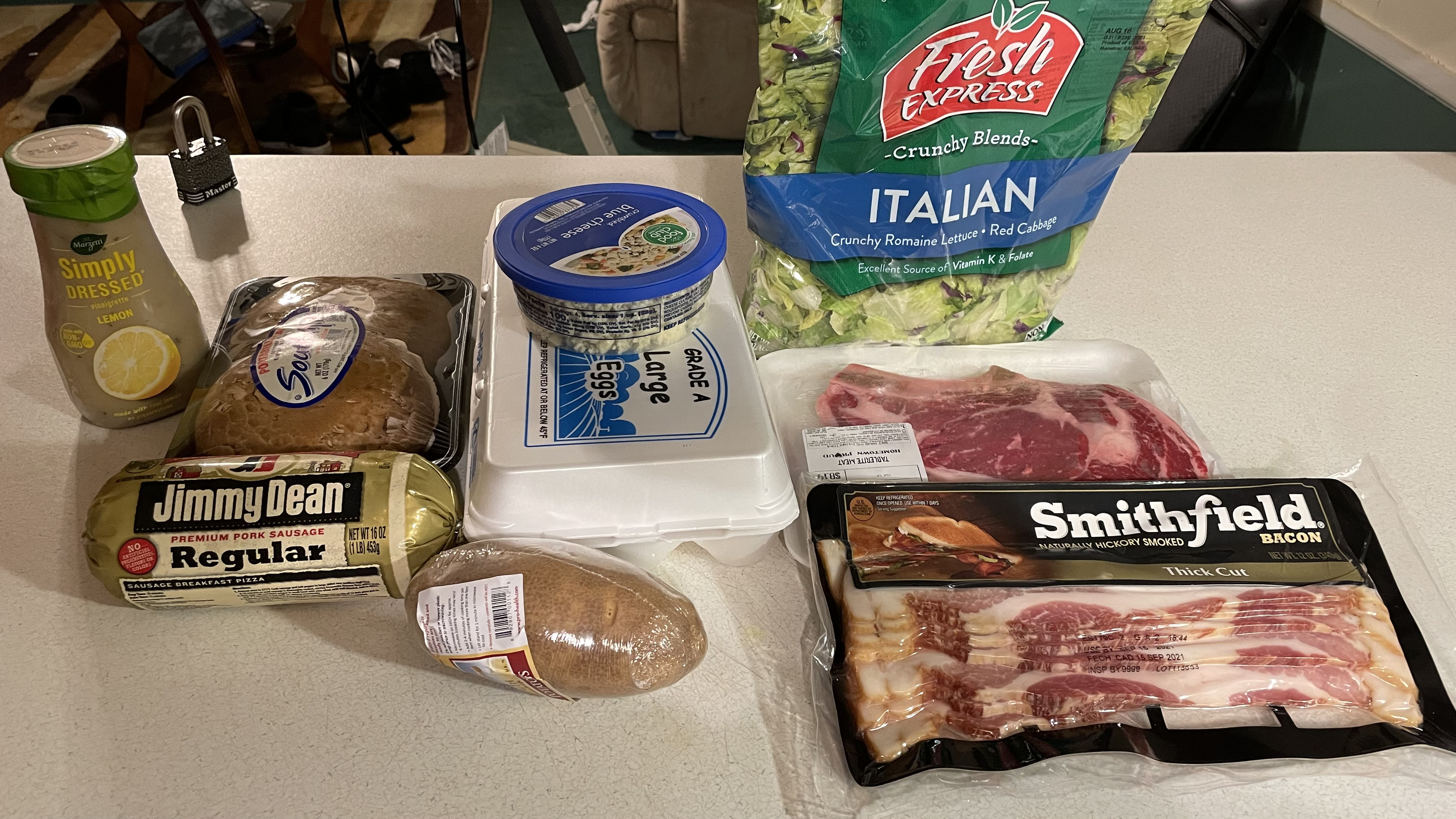I have a question. Does this look like $50 worth of groceries to anyone? I remember the days when there was a lot more in your grocery basket when you spent $50. I have not treated myself to a steak in a long while. This year, they cost twice what they did last year. I have been refusing to pay what they are asking. The steak in the picture just happened to cost half of what they usually cost.